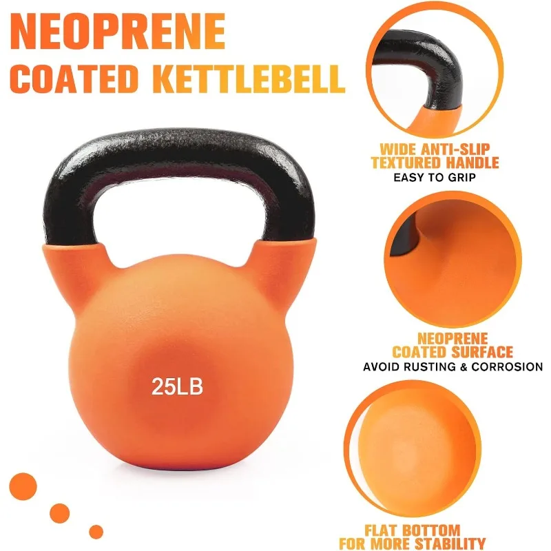 This neoprene-coated solid cast iron kettlebell set offers a versatile solution for strength training, cross-training, and weight loss exercises. Available in weights from 5 to 50 lbs, each kettlebell provides a secure, non-slip grip and protects floors from damage.
